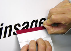 裏紙をゆっくり剥がします。裏紙を剥がしたらステッカーの粘着面全体に霧吹きで中性洗剤入りの水を霧吹きで噴いて下さい。 |