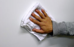 貼る面に付着しているホコリ、汚れを水で洗浄します。オイルやワックスが付着している場合は灯油やアルコール等をしみ込ませたウエスで完全に落として下さい。 |