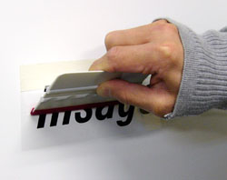 スキージ等で中心から外へこすり圧着していきます。ここで、しっかりと水を抜いて下さい。 |